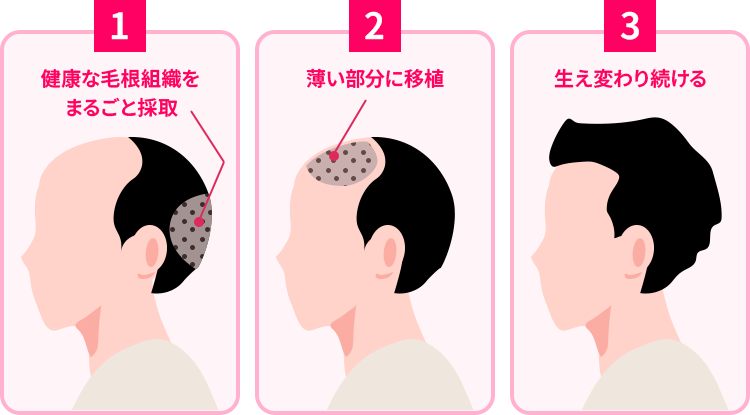 後頭部や側頭部の健康な髪を採取し、薄毛部分に移植する施術です。